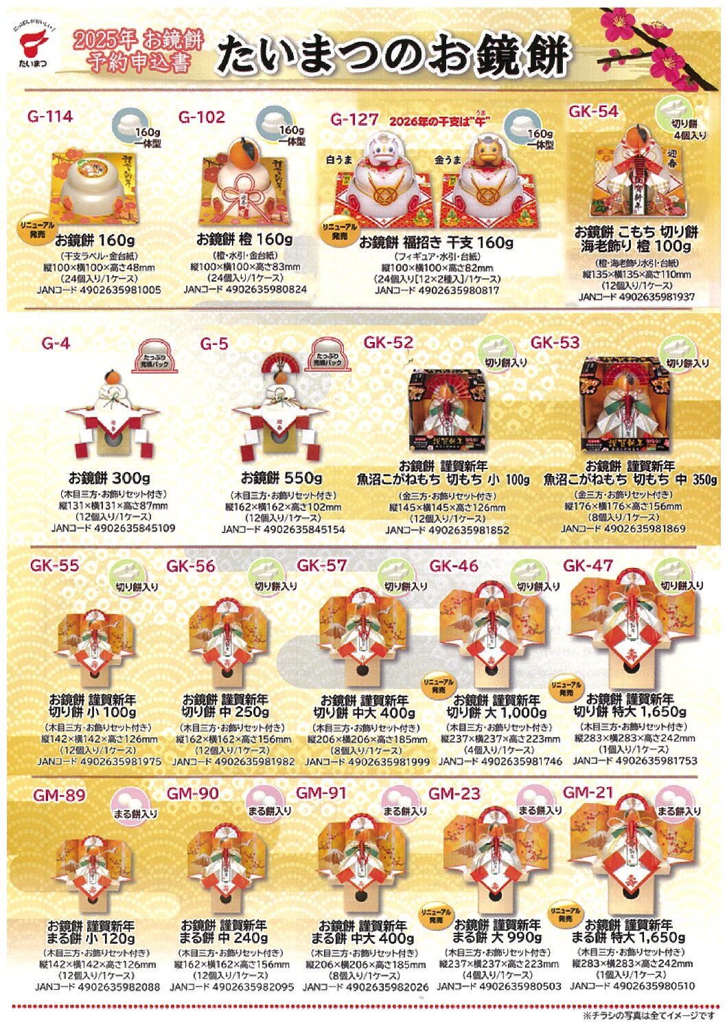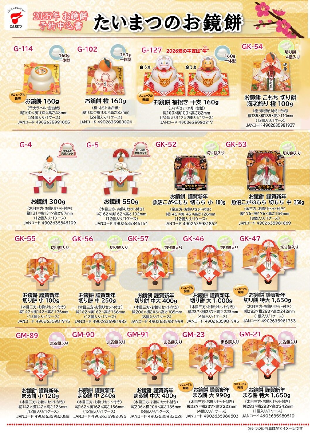 『新しい年の幸せを運ぶ「年神様」をお迎えするために、お鏡餅を飾りませんか?』 今年は米の生産量不足の為、メーカー発注は早々21日に締め切りになりましたが、 当社在庫が各種数点残っております。札幌市内配達は金額に関わらず1個より 送料無料にて配達いたしますので、お手数ですが、PDFの御注文書をプリントアウトして、 必要事項を明記の上、ご注文個数を記入してFAXして下さい。 出来るだけご希望の納品日にお届けさせて頂きます。宜しくお願い致します。