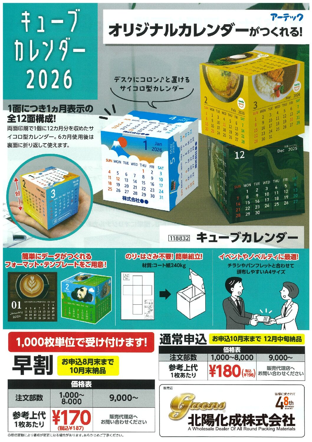 年末のノベルティギフトにオリジナルキューブカレンダーをお作りしませんか? 12面分のデータを入稿頂くだけで、テンプレートで構成致します。 1,000部からお受けいたします。どうぞご気軽にお問い合わせ下さい。