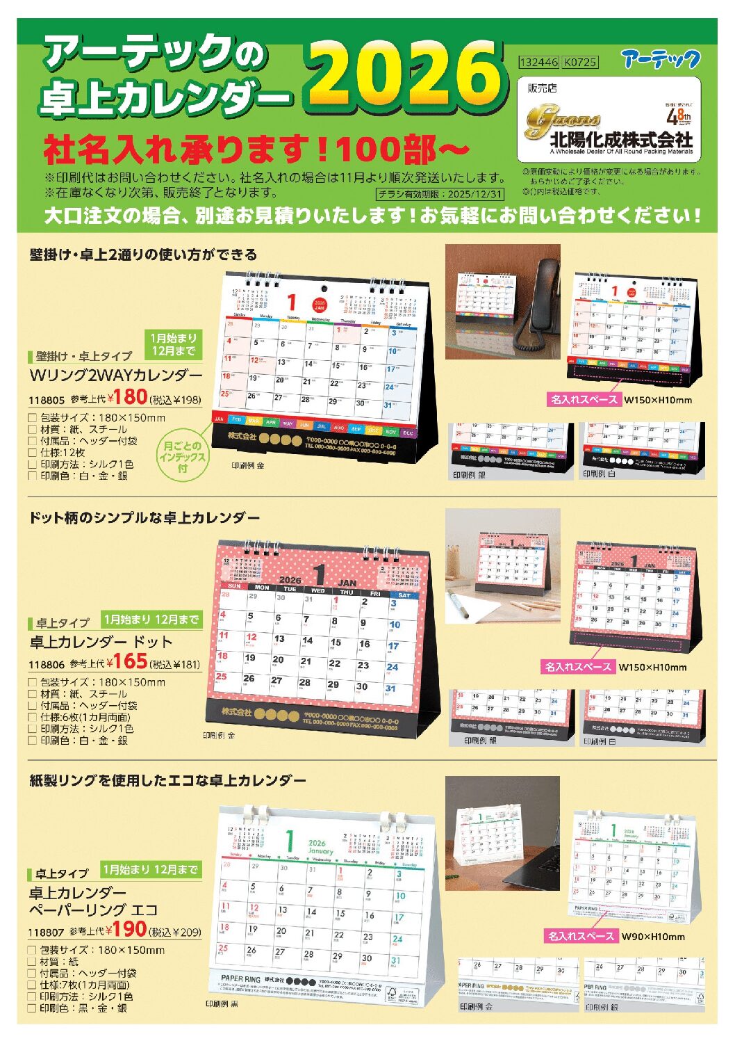 年末のノベルティギフトに卓上カレンダーは如何でしょうか? 在庫は十分に確保してありますので、まだまだ名入れも間に合います! 名入れは100部から承りますので、どうぞお問い合わせ下さい。