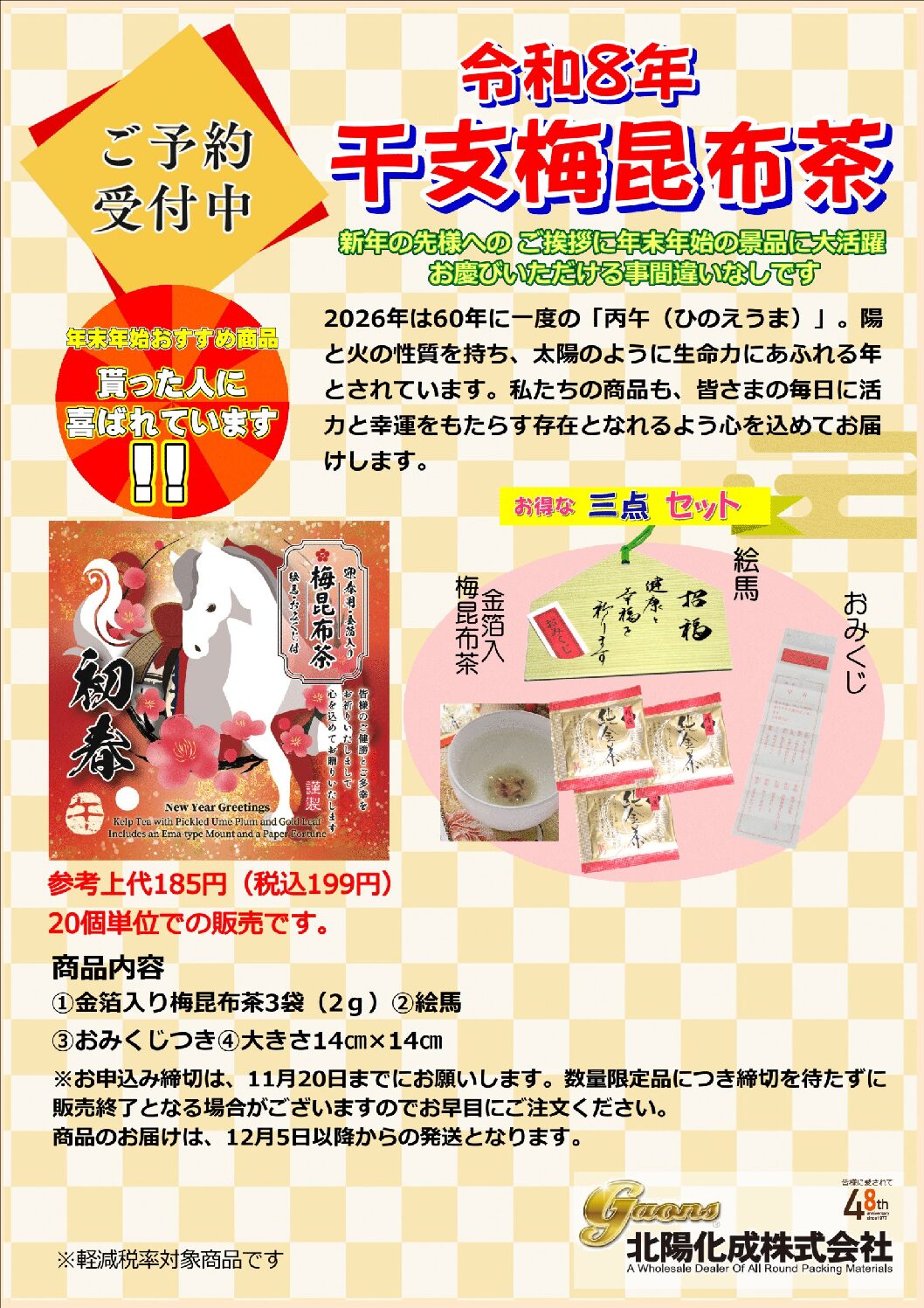 お正月にお配りいただけますと、皆様に大変喜んでいただけます、 絵馬とおみくじが付いた金箔入の梅昆布茶を、 北陽通信の読者様には一般価格よりかなりの割引にてご案内させていただきます。 お手数ですがFAX御注文書をプリントアウトしていただき、 FAXでご注文いただけますようお願い致します。 尚、こちらの商品は受注生産品の為、11月20日で締め切りとなりますのでご了承ください。 ご注文のFAXをお待ちしております。