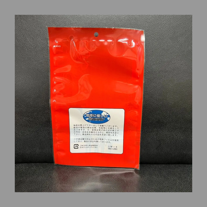 裏面記載:[地球に優しい 焼却時に有害成分が発生することはありません],[毎度お買上げ下さいまして有難うございます。製品の製造の際は品質、包装等にご注意をしておりますが、万一変質等があればお買上げ月日・店名をお書きそえの上、現品をお送り下さい。郵送料をそえ代品をお送り致します。],[この袋は酸化防止のための特殊フィルムを使用しており、製品の安全を期しております。],[プラマーク,ごみに出すときは市町村の区分にしたがってください],[UM-4,180×280]